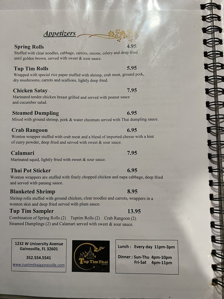 Tup Tim Thai Restaurant is a gem in the heart of midtown Gainesville, offering a wide range of Asian cuisine, including Thai food, Chinese dishes, and sushi. The restaurant boasts a casual and intimate atmosphere with friendly and efficient staff. Customers rave about the generous portion sizes and affordable prices, making it a great value for the money. The Tup Tim Sampler, chicken lettuce wraps, and mixed seafood pad Thai have received high praise for their flavors and quality. The pad Thai, in particular, stands out for its perfectly cooked noodles and fresh seafood. Overall, Tup Tim Thai Restaurant is a must-visit for anyone craving authentic Asian dishes in a welcoming setting.