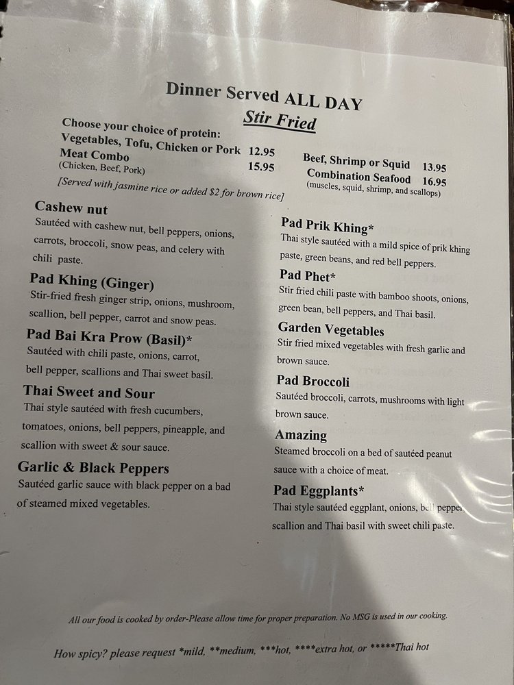 With chili paste, onions, carrot, bell pepper, scallions, and Thai sweet basil. Served with jasmine rice or brown rice.