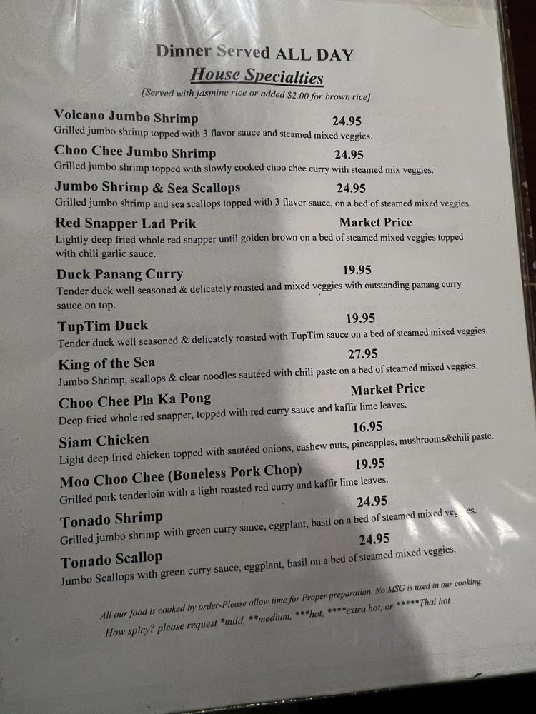 Another Thai flavored with a mild red curry paste and coconut milk, eggplants, onions, bamboo shoot, bell peppers, green bean, pineapple, and thai basil