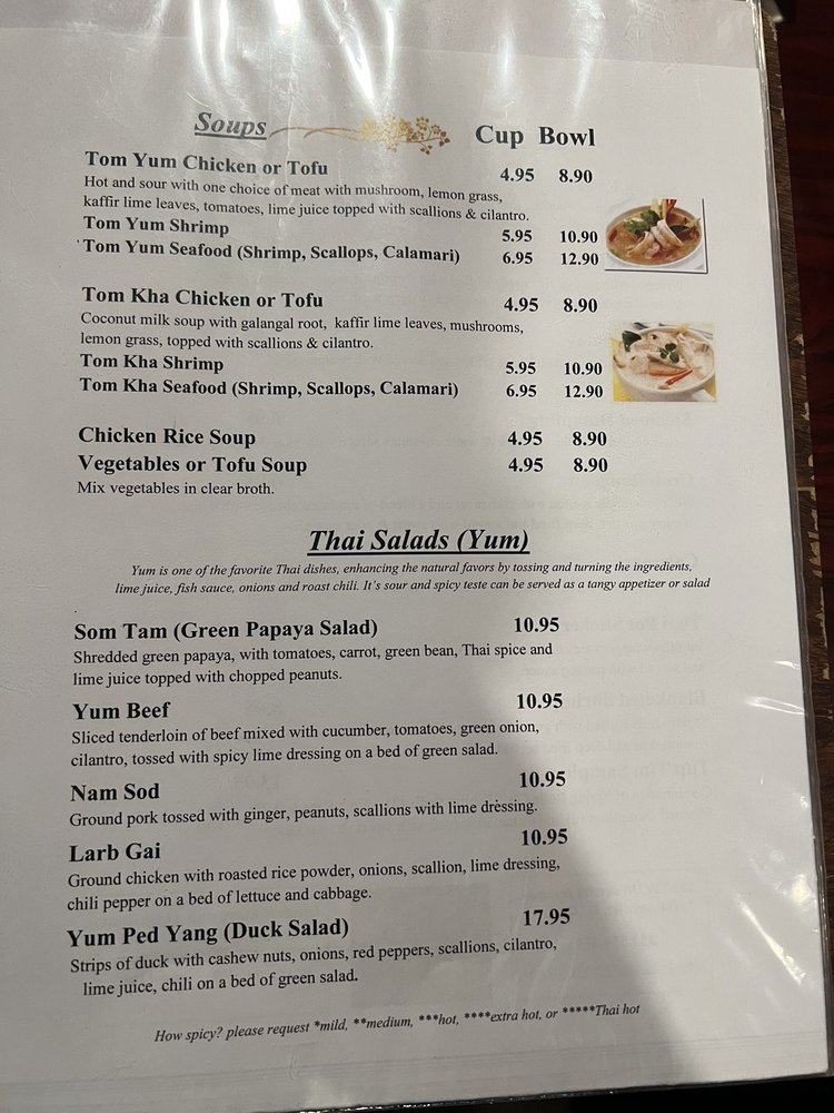 Hot and sour with one choice of meat with mushroom, lemon grass, kaffir lime leaves, tomatoes, and lime juice topped with scallions and cilantro.